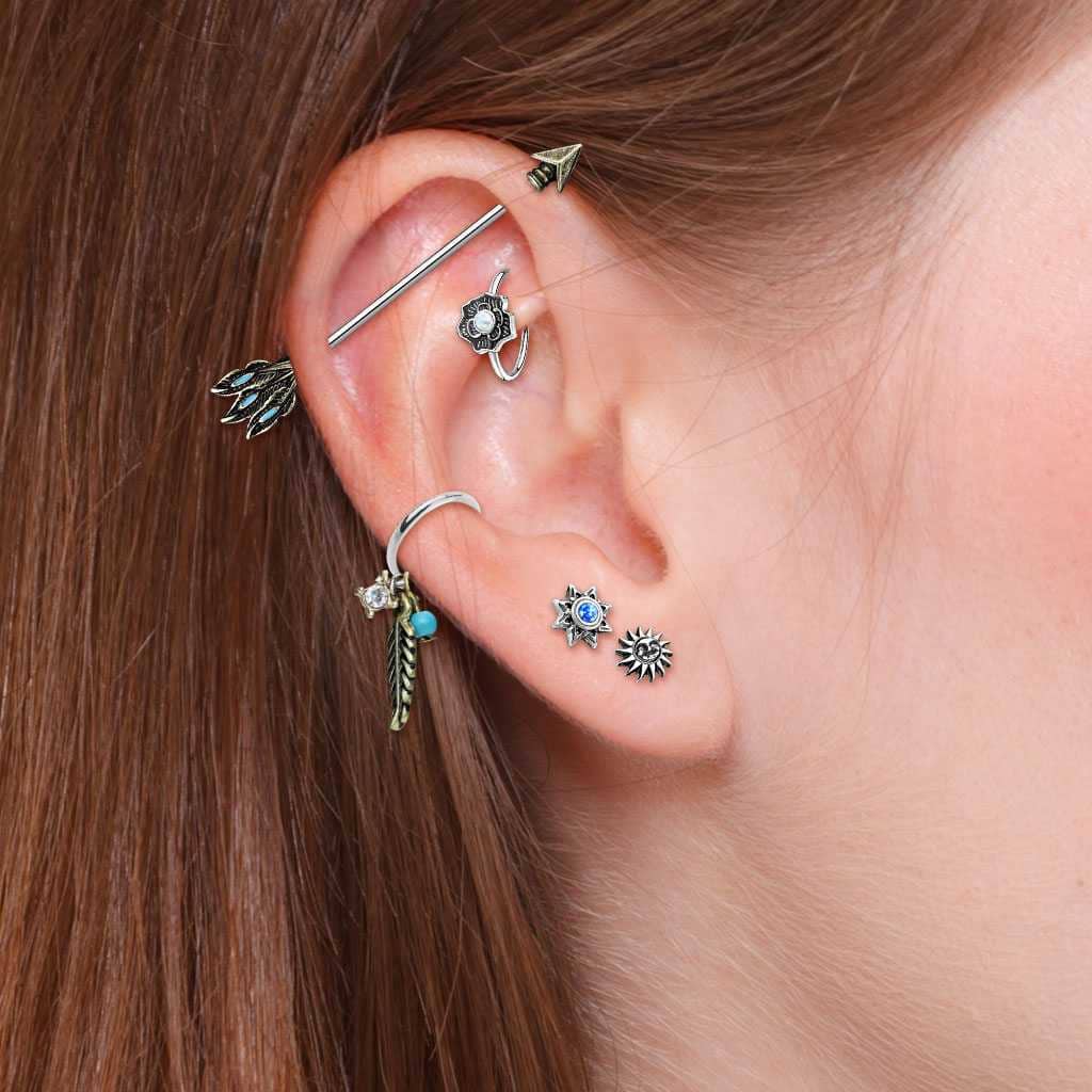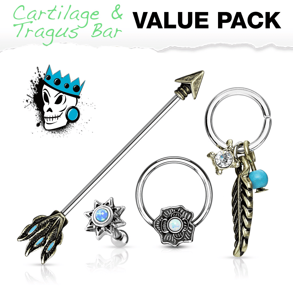 Includes one tribal industrial barbell, one tribal captive bead ring, one tribal segment ring, and two tribal studs.