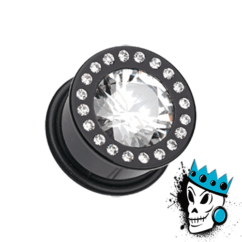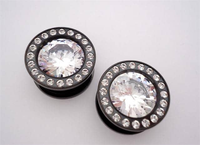 These plugs are made of 316L stainless steel and have a nice huge CZ bling in the front which is surrounded by smaller cz jewels around the rim of the tunnel.